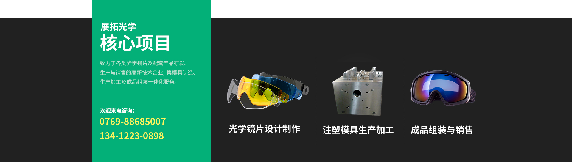展拓光學是一家以光學技術為核心的高新科技企業,深耕注塑型光學鏡片十余年,專注于“光學設計、異形高光模具制造、精密高透注塑生產、表面處理工藝”四大產業模塊,為眼視光學、車載設備、智能穿戴、安全防護等20+行業提供高精度、高性能的光學元件定制服務,產品遠銷海內外。